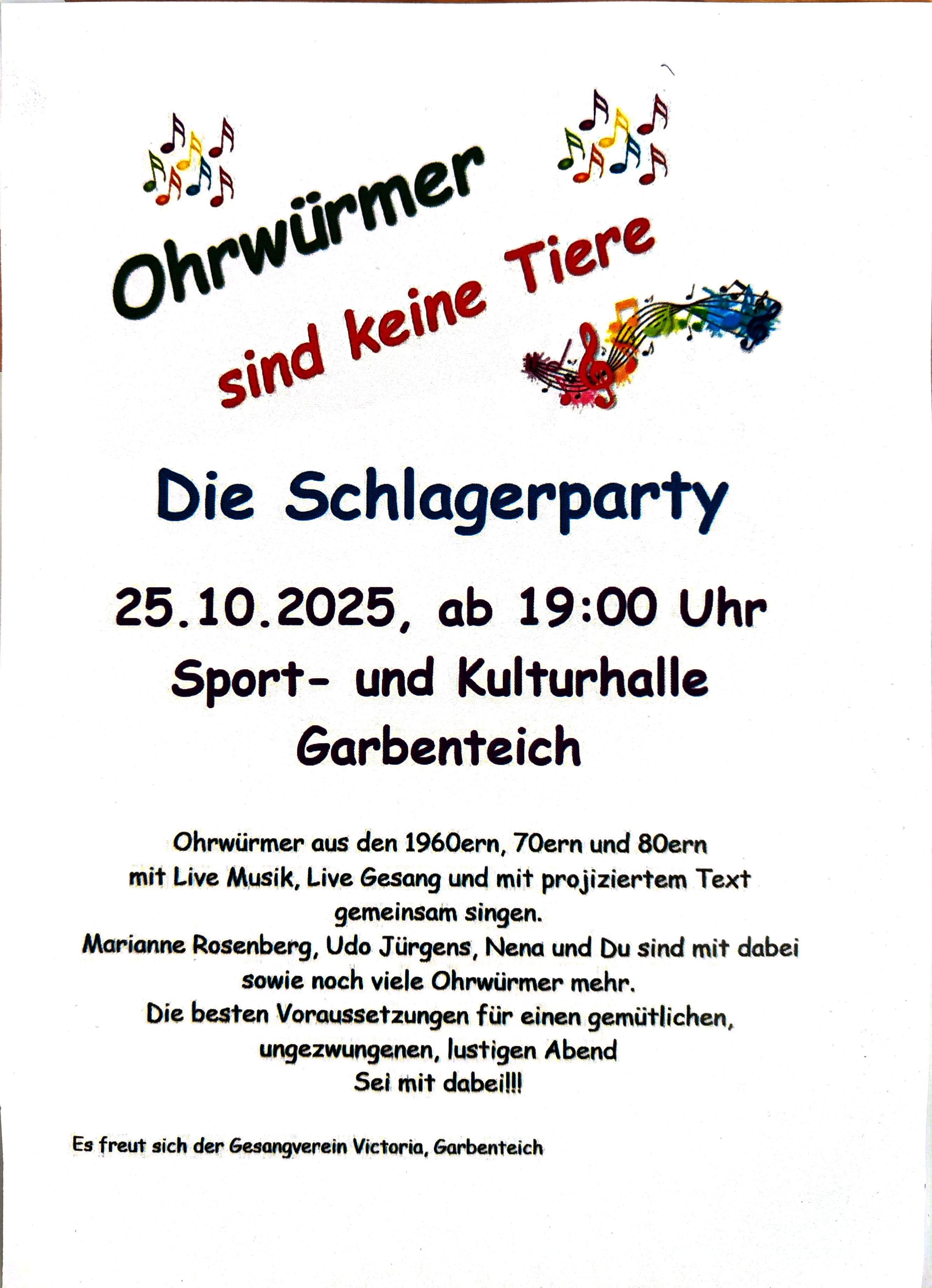 Das eigentliche Theaterwochenende am 25. und 26.10.2025 bleibt aber nicht ungenutzt. Nach dem Motto „Ohrwürmer sind keine Tiere“ soll es am Samstagabend eine Schlagerparty in der Sport- und Kulturhalle geben. Ohrwürmer aus den 1960ern, 70ern und 80ern Jahren bilden den Kern der Veranstaltung. Es wird Livemusik von „Gerfrieds und Uwes Musikexpress“ geben, die „Gute-Laune-Musik“ verbreiten. Um das Ganze noch mehr aufzulockern, werden immer wieder „Karaoke-Hits“ eingestreut. Soll heißen, der Text wird an die Wand projiziert, Live-Musik kommt dazu und alle Besucher singen mit. Marianne Rosenberg, Nena, Udo Jürgens usw. lassen grüßen. Mit passender Liedauswahl wird es auch den ein oder anderen Chorauftritt geben. Mit dabei sind neben dem Gesangverein Victoria Garbenteich, die Liederblüte aus Garbenteich, der Frauenchor Sing&Swing aus Rodheim-Bieber und Vocal Sound aus Dutenhofen. Es soll ein gemütlicher, ungezwungener, lustiger Abend werden, so der Vorsitzende Gerhold Münch. Der Eintritt beträgt 5,00 €. Es werden kleine Snacks angeboten und für Getränke ist natürlich auch gesorgt.